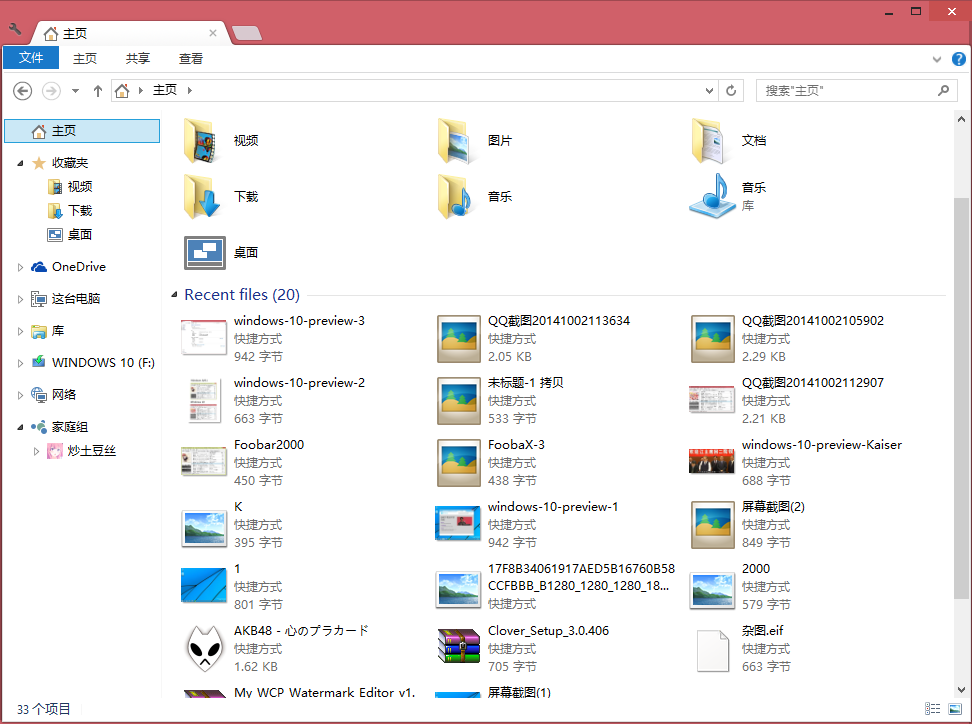 资源管理器中多了个主页,显示最近浏览文件、最常使用文件夹和收藏夹,使用快捷键Win + E默认打开资源管理器的主页,非常不适应!!!
