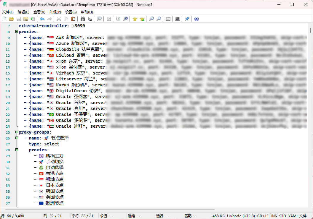 还好我常用的文本编辑器 Notepad3 是支持的,编辑 Clash 配置文件的时候很直观。